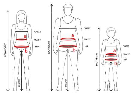 Measure the widest part of your hips, approximately at the level of the greater trochanter. (See image for reference 'b' portion)
